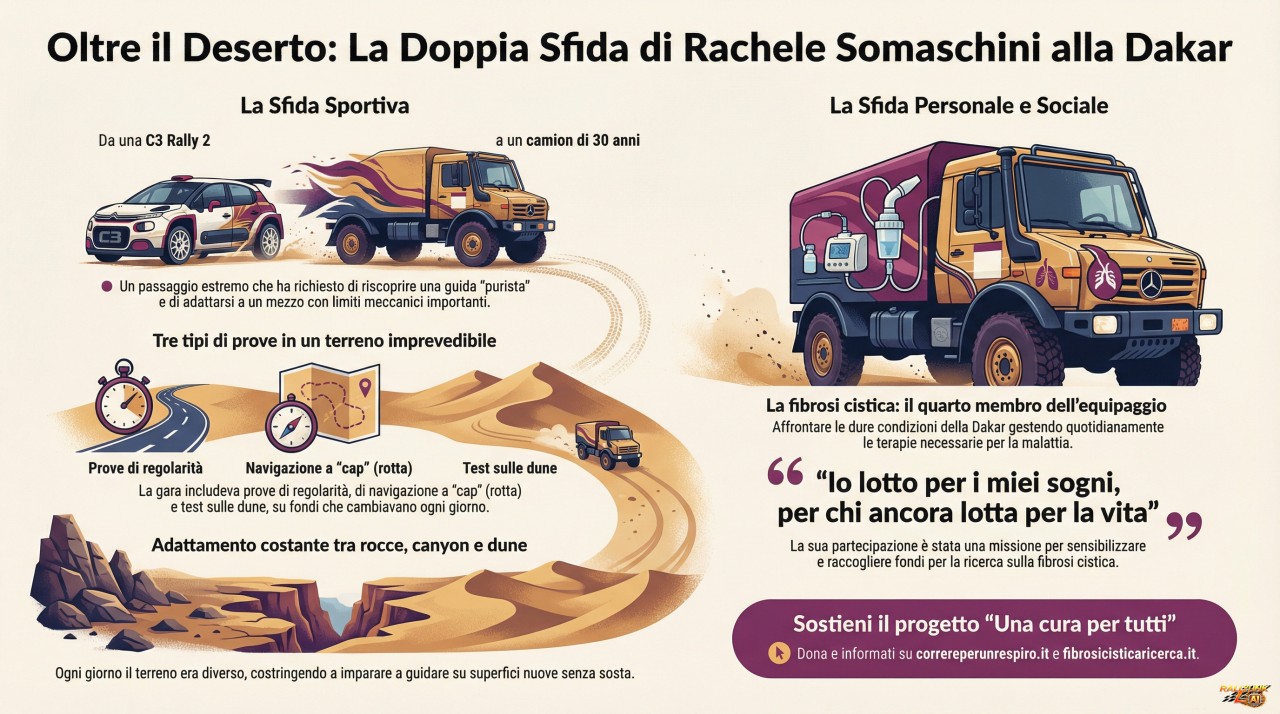 Ad accompagnarla, come sempre, c'era anche una compagna di vita tanto presente quanto indesiderata: la fibrosi cistica. Un elemento con cui Rachele convive ogni giorno e che, in un contesto estremo come la Dakar, diventa una sfida nella sfida.
