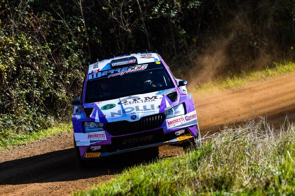 | Il pilota portacolori di New Turbomark Rally Team, in gara sulla Skoda Fabia Rally2 Evo di Erreffe Rally Team, costretto alla resa a causa di un'uscita di strada accusata sui chilometri della "Castiglion del Bosco", la prova di apertura del secondo giorno di gara. |