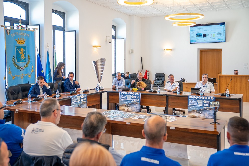 Al Palazzo Comunale di Vieste (FG) si è svolta oggi la conferenza stampa di presentazione del 15° Rally Porta del Gargano (sopra), ospitata dall'Amministrazione Comunale. Il Sindaco Giuseppe Nobiletti ha salutato gli ospiti, insieme agli Assessori Graziamaria Starace per il Turismo e la Cultura, e Gaetano Desimio per Sport, Trasporti e Attività Produttive. L'introduzione delle Autorità Comunali ha posto l'accento sull'importanza della manifestazione, nell'anno 2025 che ha portato a Vieste la titolazione di Comune Europeo dello Sport. Il rally viestano è altrettanto importante, nel quadro delle attività turistiche dell'area garganica, territorio in cui ricadono i Comuni di Mattinata, Peschici e Vico del Gargano, attraversati insieme a Vieste dal percorso di gara. La passione che accomuna gli organizzatori della ASD Piloti Sipontini alle istituzioni comunali ha fatto sì che nel tempo si sia arrivati al traguardo di questa 15° edizione, che porta Vieste all'attenzione del Motorsport nazionale. Parole di grande soddisfazione sono state espresse anche dai responsabili dell'Autorità Sportiva presenti, come il Presidente dell'Automobile Club Foggia, Raimondo Ursitti, e il Fiduciario Provinciale del CONI, Nicola Pellegrino.