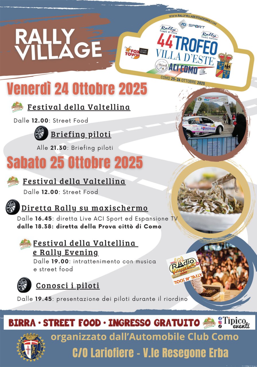 Venerdì 24 ottobre dalle ore 12 alle 23 a Lario Fiere è aperto il Festival della Valtellina con degustazioni ed intrattenimento musicale. Sabato 25 ottobre, nel corso del pomeriggio, i maxi schermi all'interno di LARIO FIERE diffonderanno le immagini delle prove speciali. Per tutta la giornata, appassionati e meccanici dei team potranno partecipare al grande happening del Festival della Valtellina degustando gustose specialità culinarie e ascoltando musica con DJ set.