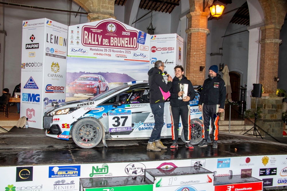 Montalcino (SI), 30 novembre 2025 – Il Rally del Brunello ha chiuso la stagione dell'MRF Rally Trophy Italia 2025, seconda edizione del monogomma MRF Tyres abbinato al Campionato Italiano Rally Terra. Sulle strade toscane è stato consegnato l'ultimo titolo ancora in palio: il Raggruppamento B riservato alle vetture quattro ruote motrici non Rally2/R5. La sfida annunciata tra Paolo Maria Tosetto e Federico Moretto si è risolta già nelle prime battute di gara, rendendo di fatto aritmetico il successo del pilota vicentino prima ancora di raggiungere metà della prima giornata. Il momento decisivo è arrivato sulla PS1 bis, secondo tratto cronometrato, quando Moretto–Michi sono incappati in una spettacolare uscita di strada senza conseguenze per l'equipaggio. Con il principale rivale fuori gara, Tosetto, navigato da Alessio Angeli, ha potuto amministrare il vantaggio che già aveva accumulato sulla prima prova e completare in sicurezza la gara toscana al volante della Ford Fiesta Rally3 di Lorenzon Racing, festeggiando il titolo in Piazza del Popolo a Montalcino al termine dell'ultima speciale. Per lui si chiude una stagione iniziata con due vittorie chiave e costruita sulla regolarità mostrata lungo tutto l'arco del campionato. Nel Raggruppamento A, Angelo Pucci Grossi e Francesco Cardinali hanno ritrovato il ritmo dopo diversi mesi di assenza, portando la Škoda Fabia RS Rally2 della Scuderia Malatesta all'ottavo posto assoluto. Una prestazione concreta, accompagnata da tempi interessanti che segnano un rientro positivo nella serie. Nel Raggruppamento C, Leonardo Pierulivo e Marco Amato hanno chiuso quinti tra le Rally4 con la Peugeot 208 di Race Elba, confermando l'affidabilità e la costanza mostrate nelle gare affrontate durante l'anno. Il Rally del Brunello ha rappresentato il round più impegnativo della stagione, con oltre 105 chilometri cronometrati e un percorso vario, veloce e tecnico, che ha confermato ancora una volta la qualità della sfida toscana e il buon grado di performance degli pneumatici MRF Tyres. | |