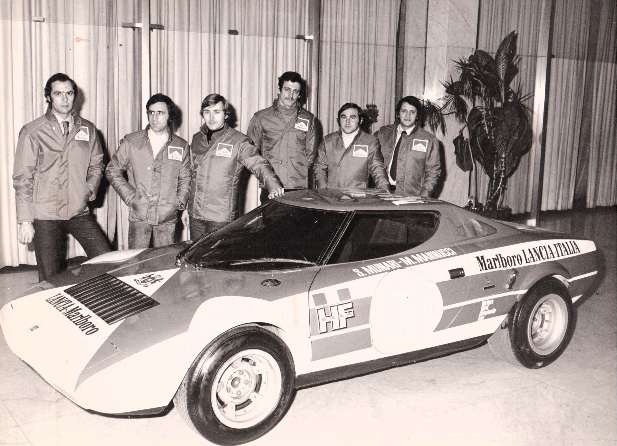 Nella foto: sopra, Sandro Munari (sx) con la squadra Lancia. Sotto, Munari sulla Lancia Fulvia HF