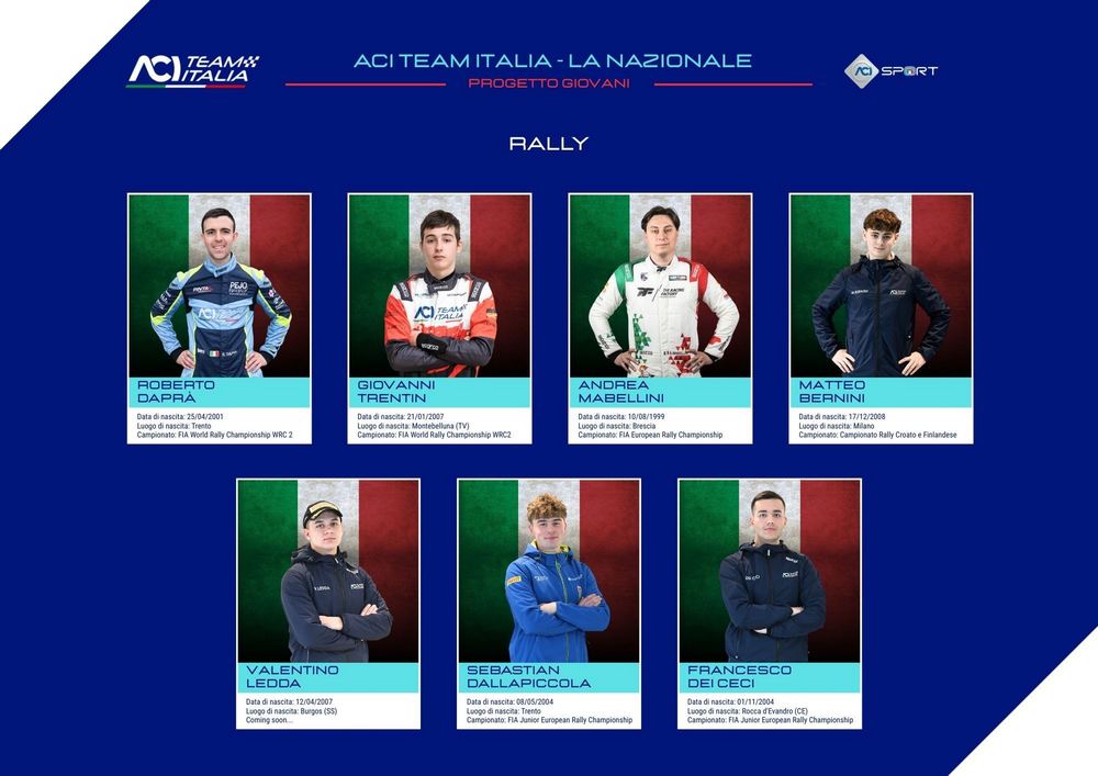 Sette alfieri rappresenteranno la squadra ACI Team Italia nei rally. Due di loro hanno già ripreso il loro percorso nel Mondiale – FIA World Rally Championship all'interno della categoria WRC2. Dopo l'ottima stagione d'esordio lo scorso anno, impreziosita dalla vittoria nella gara di casa al Rally Italia Sardegna, il trentino Roberto Daprà (classe 2001) con Luca Guglielmetti ha già iniziato la nuova stagione con l'ottimo secondo posto al Rallye Monte-Carlo in apertura di campionato. Partenza lanciata anche per il trevigiano Giovanni Trentin (2007) che insieme a Pietro Ometto ha preso il via al Rally Sweden. Entrambi sfoggeranno il tricolore sulle Skoda Fabia RS Rally2 gestite dalla Delta Rally. Un'iniziativa importante per promuovere l'Italia in campo internazionale riguarda l'Europeo – FIA Europea Rally Championship, che vedrà protagonisti due piloti di ACI Team Italia sulle vetture Lancia gestite da F.P.F. Sport. Il bresciano vicecampione europeo Andrea Mabellini con Virginia Lenzi su Ypsilon HF Integrale Rally2 lotterà per il titolo nella categoria maggiore, mentre nel FIA Junior ERC il casertano Francesco Dei Ceci, vicecampione italiano Junior nel 2024, vivrà il suo secondo anno nella categoria due ruote motrici in coppia con Danilo Fappani sulla Ypsilon HF Rally4. Si è guadagnato un sedile nell'Europeo Junior anche Sebastian Dallapiccola, campione italiano Junior uscente che è pronto al debutto oltre i confini nazionali. Anche il giovane trentino sarà al volante di una Lancia Ypsilon HF Rally4, gestita in questo caso da Baldon Rally, affiancato dal navigatore Nicolò Lazzarini anche lui emerso dai programmi di formazione della Federazione.