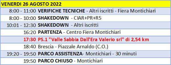 La partenza del rally avverrà dall'uscita del Parco Assistenza alla Fiera di Montichiari a partire dalle 16:20, mentre la prima vettura - Matteo Giordano - entrerà in prova speciale alle 17:30