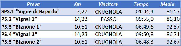 La classifica ora vede Crugnola con 19"1 su Fabio Andolfi e 34"0 su Damiano De Tommaso che dovrà arrivare al parco assistenza per poter riparare la vettura