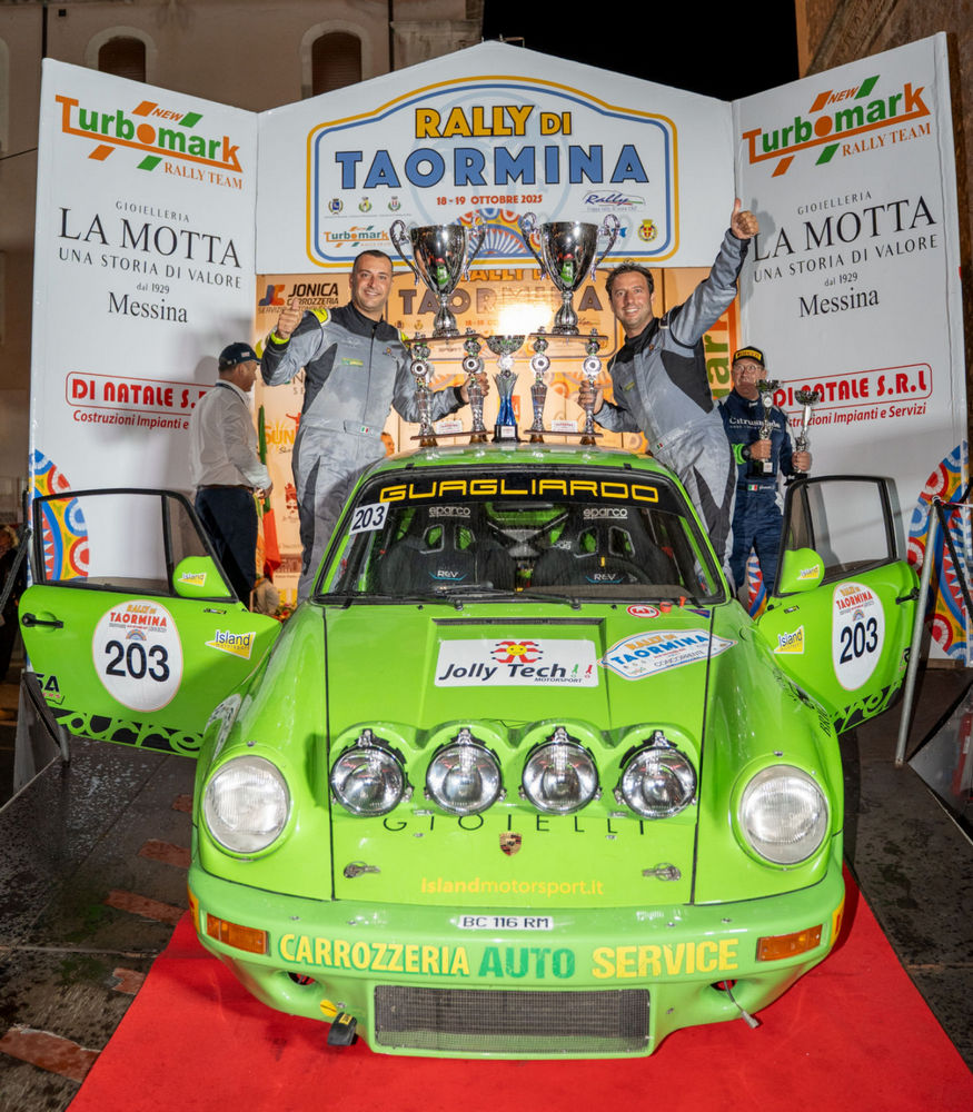 Taormina (Me), 20 ottobre 2025 - Un vero e proprio tripudio in casa Island Motorsport (sempre in partnership con Tempo srl), una volta archiviato il Rally di Taormina Historic Legend, chiusura stagionale del Campionato Siciliano Rally Auto Storiche, andato in scena lo scorso fine settimana. Procedendo con ordine, il sodalizio presieduto da Eros Di Prima, fregiatosi tra l'altro per il secondo anno consecutivo della Coppa Scuderie, ha festeggiato la vittoria conseguita da Giuseppe Termine (Porsche 911 Carrera RS di 2° Raggruppamento), in coppia con Sergio Musso. Seppur al debutto sui selettivi asfalti del Messinese, il pilota originario di Ribera, già con trascorsi di rilievo in pista, è passato al comando sin dalla prima tappa del sabato, per consolidare l'indomani la leadership e amministrare il vantaggio cumulato sino al traguardo, dopo aver svettato in cinque prove speciali delle otto effettivamente disputate.