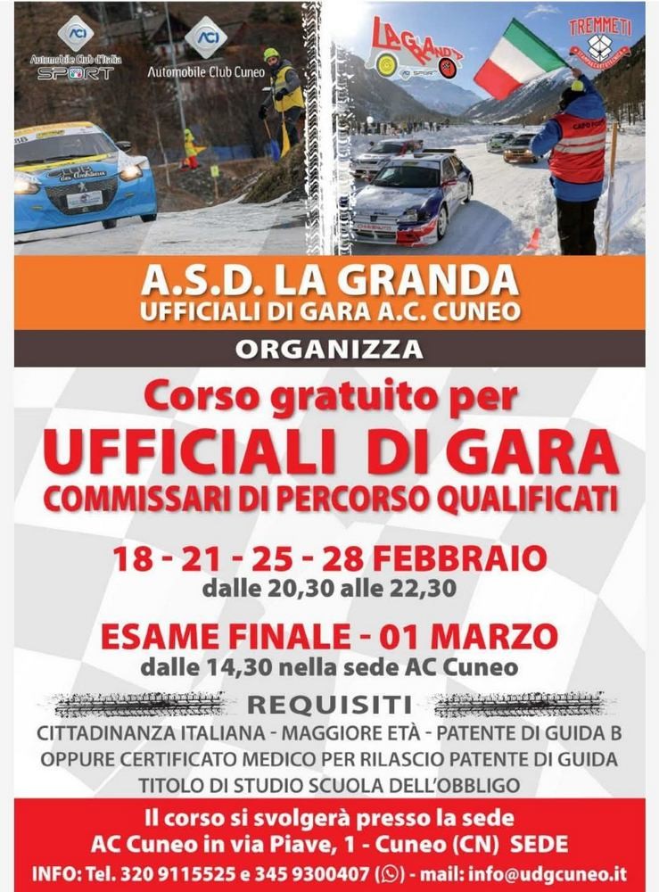 Nel mese di febbraio, presso la sede dell'Automobile Club Cuneo, si terranno quattro lezioni per formare i commissari di percorso. L'Associazione "La Granda" Ufficiali di Gara, in collaborazione con l'Automobile Club Cuneo, organizza un corso per ottenere la licenza da Ufficiale di Gara con abilitazione a Commissario di Percorso in occasione di eventi motoristici quali rally, slalom e molte altre discipline. Il corso, che si terrà presso i locali della sede dell'AC Cuneo (Via Piave, 1), si svolgerà nei giorni di martedì 18 febbraio, venerdì 21 febbraio, martedì 25 febbraio e venerdì 28 febbraio, dalle ore 20:30 alle ore 22:30, con il test finale previsto per sabato 1° marzo dalle ore 14:30, sempre nella medesima sede. Per l'ammissione al corso e l'ottenimento della licenza, è necessario avere i seguenti requisiti: cittadinanza italiana, età non inferiore ai 18 anni, possesso della patente di guida B oppure certificato medico per il rilascio della patente B e titolo di studio scuola dell'obbligo. Per tutte le informazioni a tal proposito, e le relative iscrizioni al corso, si richiede di contattare attraverso il seguente indirizzo e-mail