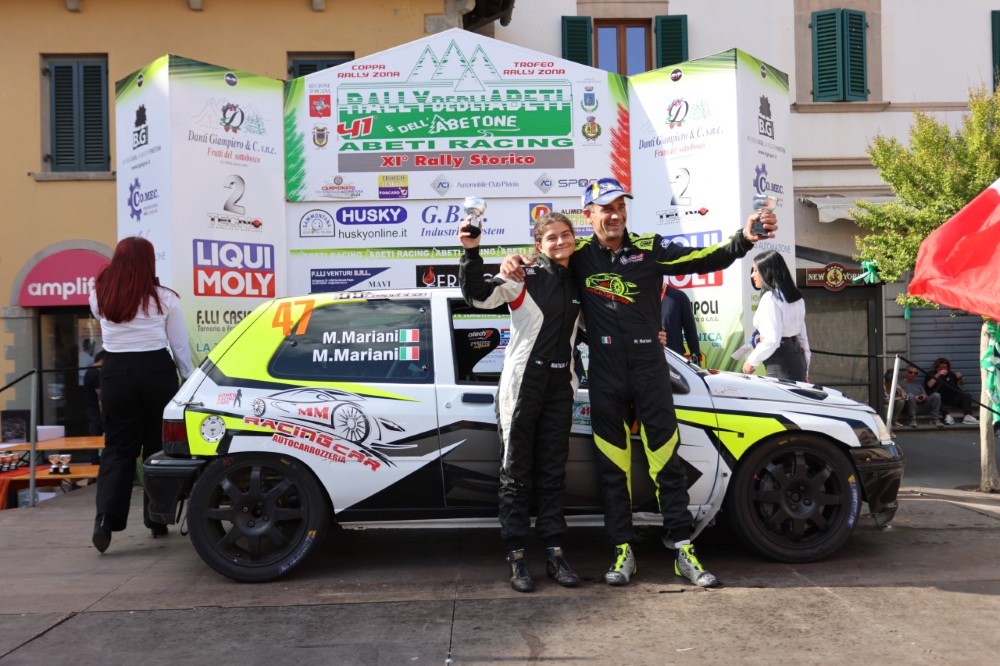 Nella foto (free copyright Amicorally): Mariano e Matilda Mariani festeggiano sul palco d'arrivo del Rally degli Abeti.