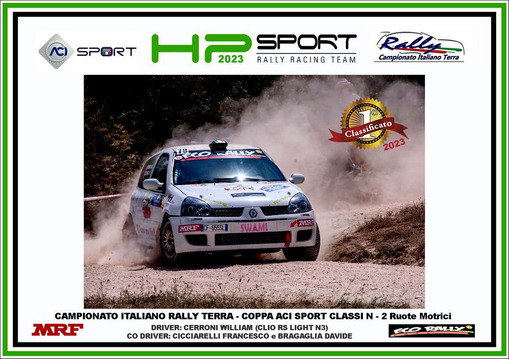 Si avvicina l'ultimo semaforo verde del Campionato Italiano Rally Terra (CIRT) in programma a Monza nel fine settimana con la disputa dell'omonimo rally. Con la pubblicazione dell'elenco iscritti della gara, è arrivata anche la titolazione per il driver frusinate William Cerroni portacolori della struttura laziale HP Sport, su Clio RS Light N3 attuale leader della classifica N Due Ruote Motrici, si aggiudica così, il titolo 2023 con una gara di anticipo, vista l'assenza del suo diretto avversario Marco Mangiarotti, l'unico ancora in grado di contendere la vittoria finale al capoclassifica Cerroni. Insieme a Francesco Cicciarelli sul sedile di destra, la coppia frusinate, con i suoi 33 punti collezionati nelle quattro gare del CIRT fin qui disputate: Val d'Orcia, Adriatico, Nuraghe e al Marche, con la sua Renault Clio RS Light hanno conquistato il titolo relativo alla Coppa ACI Sport Classi N - Due Ruote Motrici per la stagione 2023. Una gran bella soddisfazione per i due giovani rallisti della Ciociaria, che scrivono così il loro nome nell'albo d'oro del CURT Due Ruote Motrici Classe N, dopo una lunga ed impegnativa cavalcata sugli sterrati italiani.