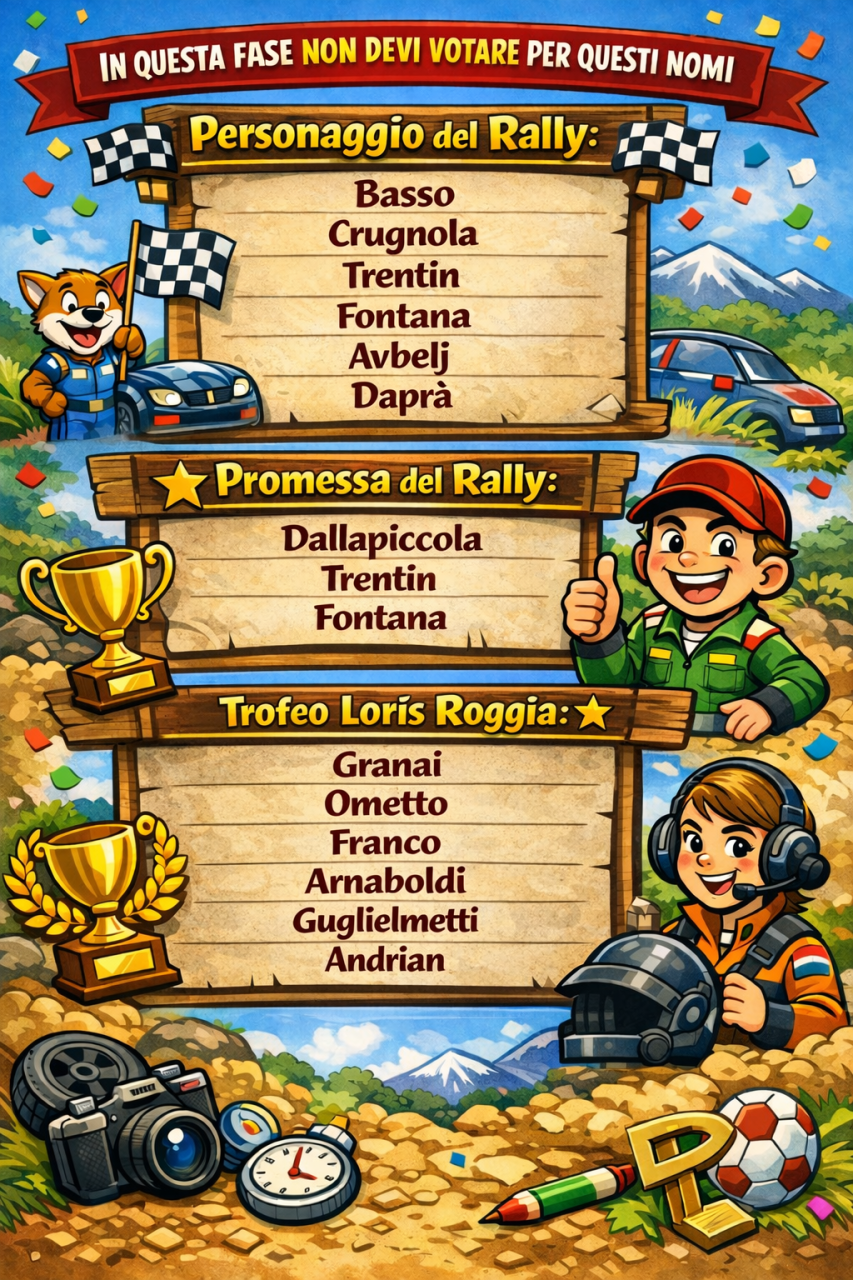 Come sempre - per ogni categoria - Vi proporremo nella fase finale dei sondaggi, dieci personaggi sui quali esprimere la vostra preferenza. Di questi dieci, alcuni li proponiamo noi "d'ufficio", cioè che sono personaggi che durante il 2025 hanno vinto un titolo rally. Voi, in questa prima fase, completerete la lista dei dieci personaggi, proponendoci nella fase di Nomination, il personaggio che secondo voi è meritevole di essere ammesso al sondaggio, anche se non ha vinto alcun titolo.