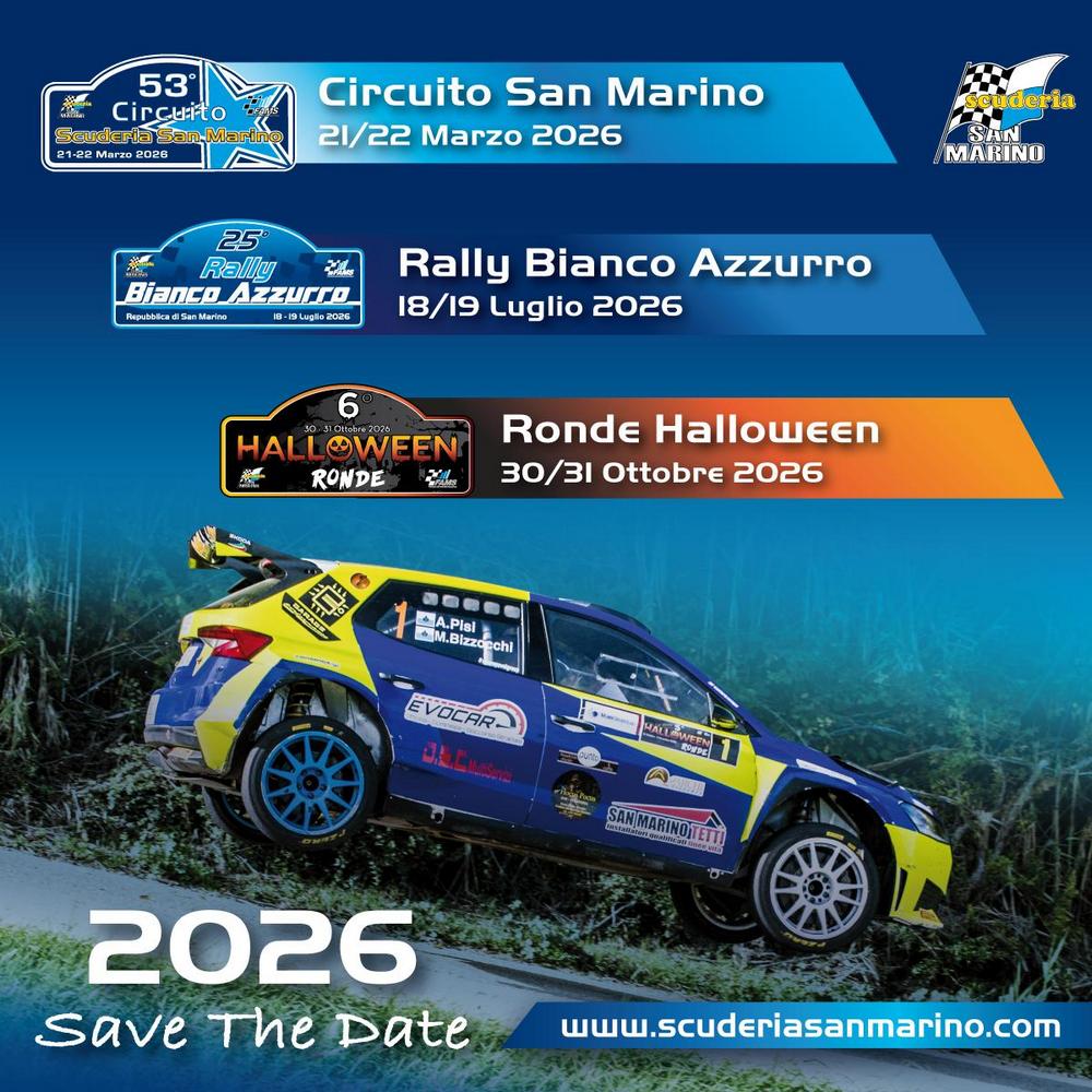 Nel cuore dell'estate spazio invece al Rally Bianco Azzurro, uno degli appuntamenti più attesi e di maggior successo firmati Scuderia San Marino. Le vetture torneranno a dare spettacolo nelle giornate del 18 e 19 luglio, confermando una gara ormai punto di riferimento per appassionati e addetti ai lavori. Come da tradizione, la stagione si chiuderà con il Ronde Halloween, giunto alla sesta edizione. Per il 2026 la manifestazione verrà anticipata di qualche giorno: la gara scatterà venerdì 30 ottobre per concludersi proprio nella suggestiva giornata di Halloween, sabato 31 ottobre.