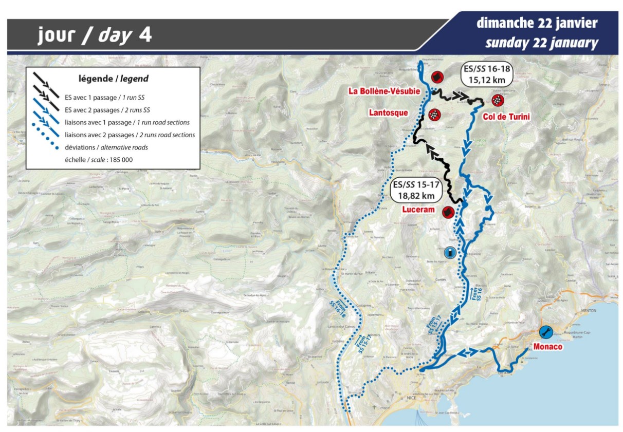 Ultimo giorno di gara con due prove speciali da ripetersi due volte per un totale di 67,88 km che portano la lunghezza complessiva dei tratti cronometrati di questa novantunesima edizione del rally monegasco a 325,02 km.