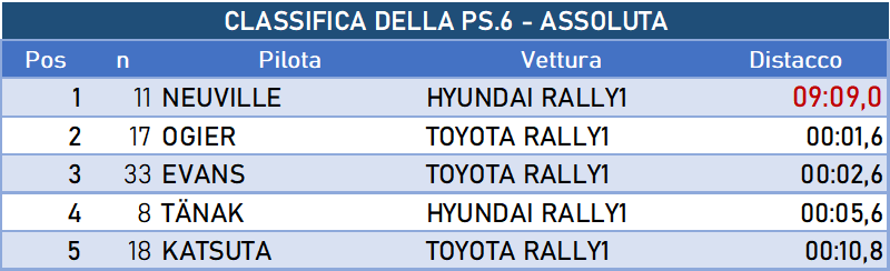 Per il resto nulla da segnalare se non il classico ordine di partenza con i P1 (i conduttori delle vetture Rally1) che partiranno in ordine inverso rispetto alla classifica maturata ieri. Quindi nell'ordine impegneranno la prova ogni tre minuti: Katsuta, Munster, Mikkelsen, Fourmaux, Tanak, Neuville, Ogier ed Evans. A seguire tutti i P2 in ordine di classifica, quindi Gryazin, Lopez, Rossel, Solberg ... intervallati da due minuti. Tutti gli altri concorrenti in ordine di classifica ed intervallati da un minuto l'uno dall'altro.