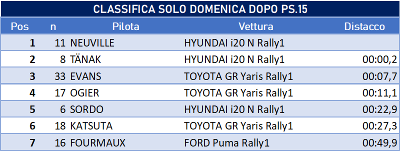 Per il campionato importante la classifica della sola domenica che vede Neuville al comando ed Evans al terzo posto. Nel WRC-2 prosegue la cavalcata vincente di Sami Pajari con la Toyota con Yohan Rossel che con la Citroen fa del suo meglio ma il ritardo accumulato nelle tappe precedenti lo costringe in seconda posizione.