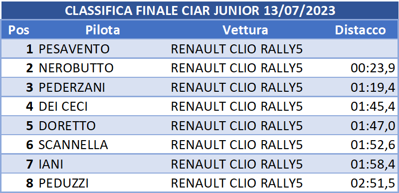 | CIAR Due ruote motrici: 1.Pisani 2.Farina+3.0 3.Nicelli+17.7 4.Cogni+38.6 5.Cazzaro+45.3 6.Lucchesi+54.8 7.Rendina+1:08.4 8.Cardi+2:20.7 |