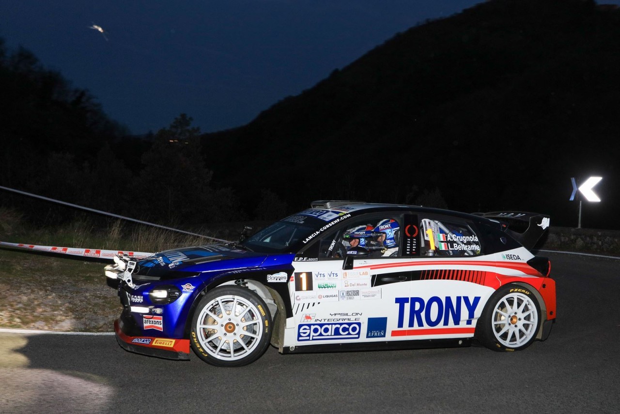 Il Campionato Italiano Assoluto Rally Sparco 2026 è iniziato nel segno di Andrea Crugnola e Luca Beltrame, autori di due scratch nelle cinque prove affrontate durante la giornata inaugurale al Rally Il Ciocco e Valle del Serchio. La 49^ edizione della classica garfagnina sta rispettando ampiamente le aspettative, grazie a tratti cronometrati estremamente selettivi, con continui cambi di ritmo e grip che hanno messo alla prova i 104 equipaggi partiti nel pomeriggio dalle mura di Lucca in questo primo dei sette round tricolori. A guadagnare un primo vantaggio è stato proprio il pilota varesotto, che si è proposto già come riferimento per l'Assoluto sulla nuova Lancia Ypsilon Rally2, gommata Pirelli, con la quale ha fatto la differenza nel doppio passaggio sulla "Fabbrica di Vergemoli" (14,5 km) dove ha accumulato prima 4.5'', poi altri 7'' nella ripetizione in notturna, per andare a letto all'intervallo di gara con 16.3'' di vantaggio sui primi inseguitori Andrea Nucita e Rudy Pollet, al rientro nel tricolore, i migliori invece nella classifica del CIR Promozione. Il messinese sulla Skoda Fabia RS calzata Hankook ha invece aperto e chiuso le ostilità con il successo nella breve spettacolo "Il Ciocco" (2 km) e con il miglior crono sull'ultima "Calomini" (14,8 km) a fari accesi che gli ha permesso di recuperare la seconda posizione assoluta a scapito di Simone Campedelli e Tania Canton. Il cesenate sulla Toyota Yaris GR si è dimostrato comunque un valido avversario quando ha fatto suo il precedente passaggio sulla stessa speciale "Calomini", e nel finale si è tenuto agganciato al terzo posto ad appena 4 decimi di secondo da Nucita. A ridosso del podio si è distinto Roberto Daprà, con Luca Guglielmetti su altra Skoda, distante 20.1'' dalla vetta. Il pilota di ACI Team Italia è cresciuto nella seconda fase di gara, rilanciato nel finale anche da qualche miglioria apportata alla vettura nell'intervallo in assistenza che gli ha permesso di siglare anche il secondo tempo nella penultima speciale di giornata. In quinta posizione a 41.9'' sono rimasti più attardati del previsto i campioni Promozione uscenti Bostjan Avbelj e Damijan Andrejka, protagonisti lo scorso anno al Ciocco, stavolta con qualcosa ancora da correggere sulla loro Skoda per poter puntare di nuovo al vertice.