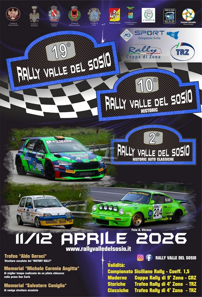 Mancano due giorni e, mercoledì undici marzo, si apriranno ufficialmente le iscrizioni al Rally Valle del Sosio. La gara, che segnerà l'esordio stagionale della Coppa Rally di Nona Zona e del Trofeo Rally di Quarta Zona riservato alle auto storiche e classiche, è giunta rispettivamente nella versione riservata alle auto moderne alla sua diciannovesima edizione, alla decima in quella per le storiche e alla seconda i quella per le classiche. Tantissime le novità della manifestazione che si disputerà sulle strade della provincia di Palermo l'undici e dodici aprile prossimi ed è organizzata dal comune di Chiusa Sclafani, con la stretta collaborazione delle amministrazioni di Bisacquino, Giuliana, Palazzo Adriano e Prizzi e il patrocinio della Città metropolitana di Palermo e dell'Unione dei comuni della valle del Sosio.