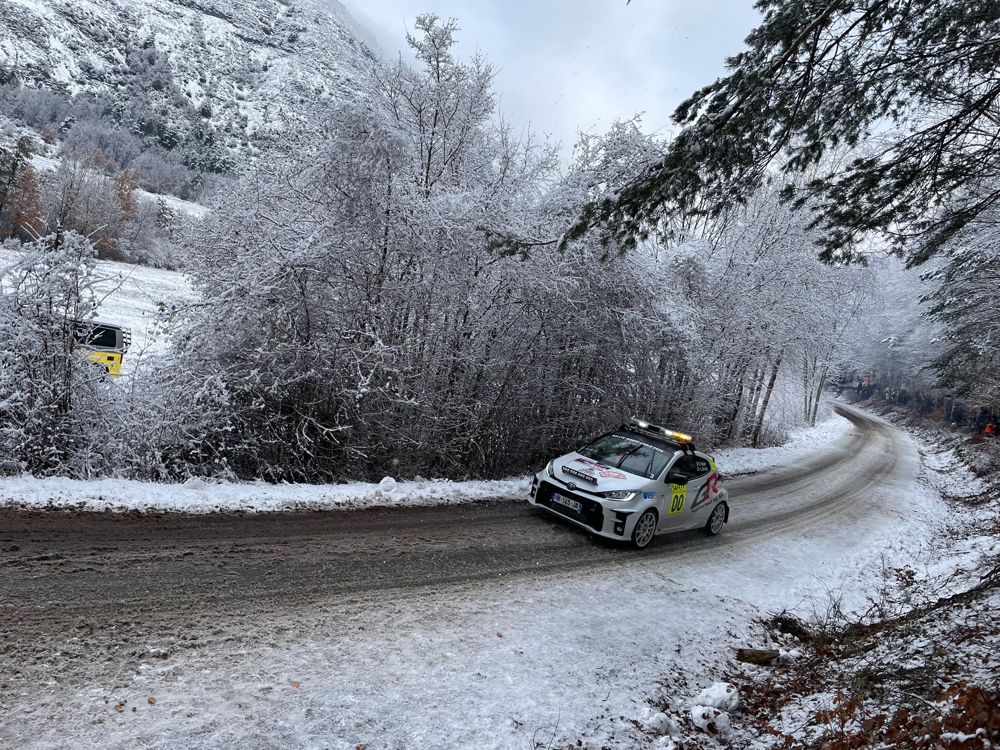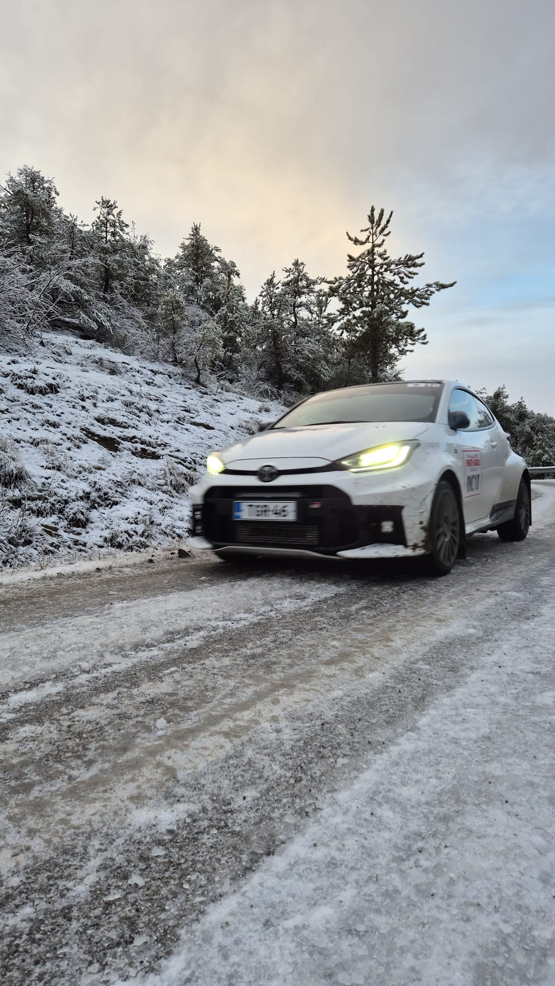 Il ghiaccio iniziale nei primi km mettono a dura prova gli equipaggi nonostante le gomme neve chiodate
