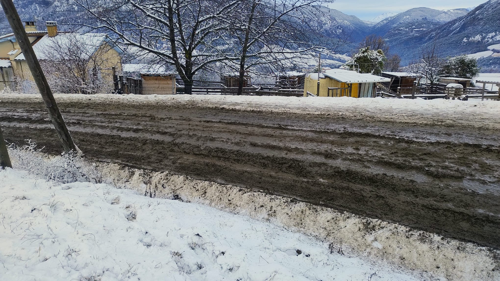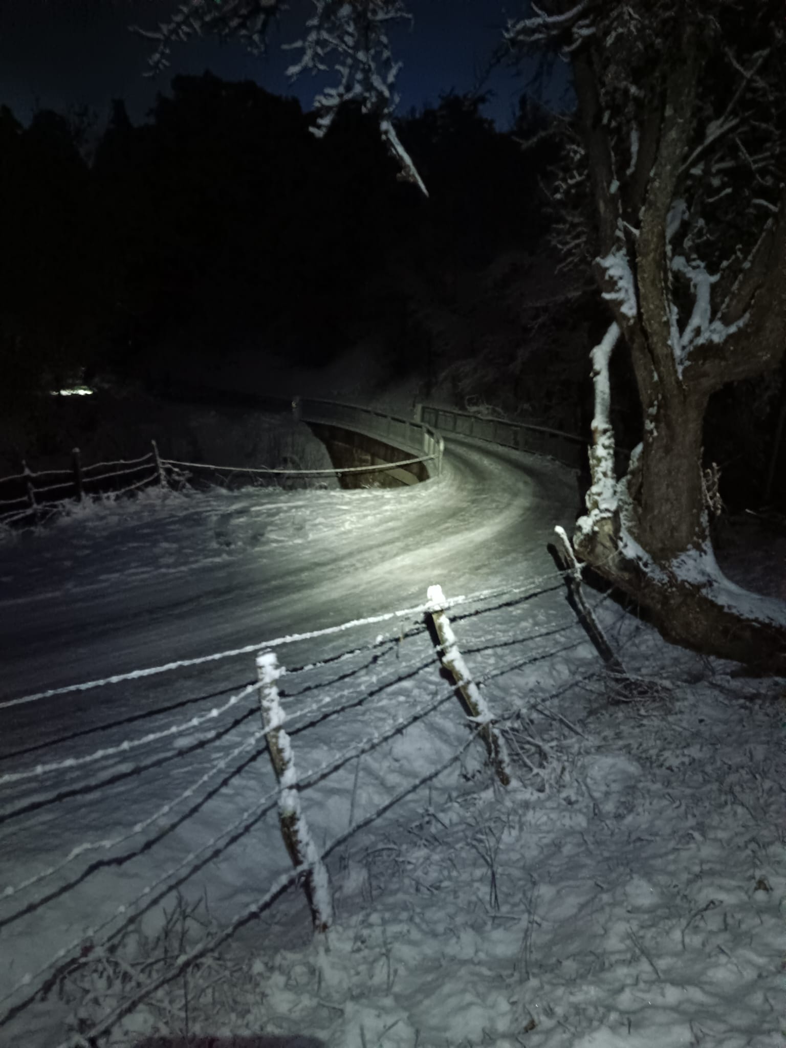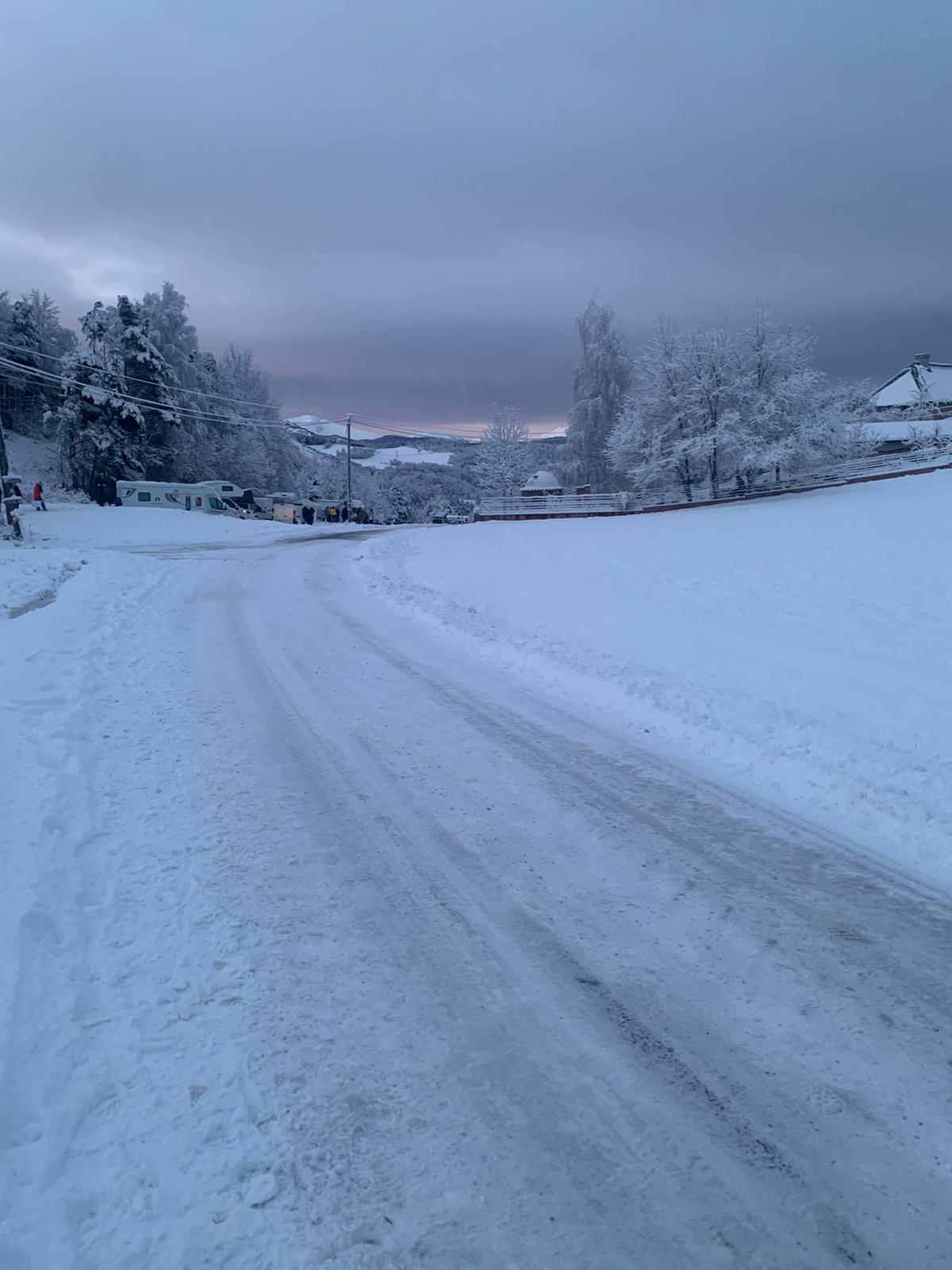 Km 2,1: ghiaccio / neve bagnata congelata sul ponte; da qui neve bagnata congelata sulla linea centrale in molte zone.