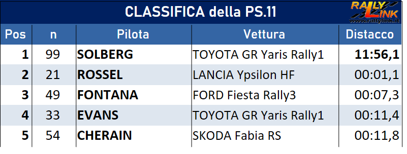 WRC2 dopo ps.11: 1.Leo Rossel 2.Gryazin+10.8 3.Camilli+1:36.2 4.Daprà+1:49.0