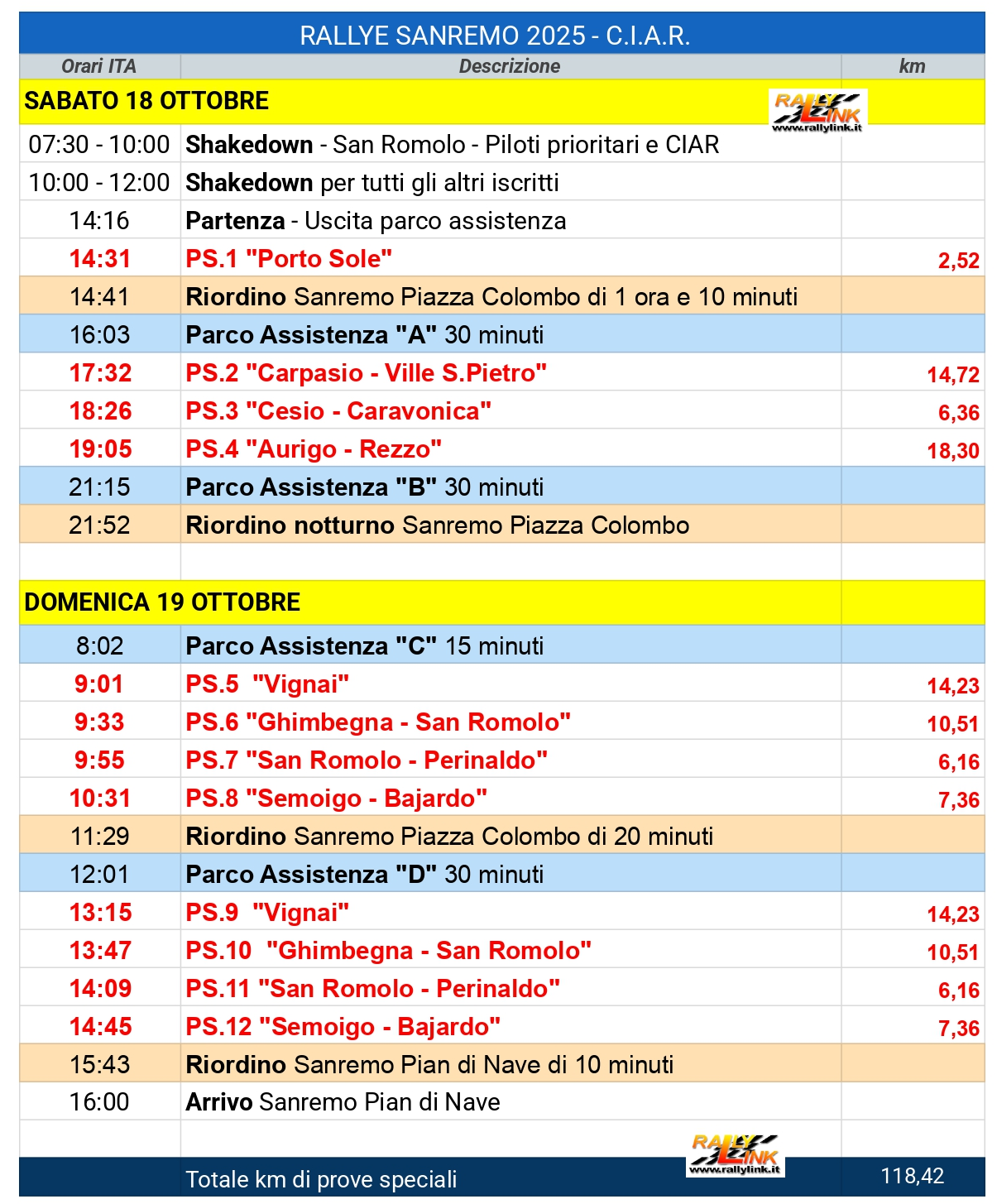 Il lungo fine settimana motoristico del Sanremo 2025 comincia mercoledì 15 ottobre con gli equipaggi del rally moderno e storico che convergeranno su Sanremo per le verifiche sportive e tecniche, e l’apertura dei due Parchi Assistenza, il moderno alla Vecchia Stazione e quello storico a Porto Sole. Dopo che giovedì 16 ottobre verranno effettuate le ultime verifiche sportive e tecniche delle due gare tricolore, i motori si accenderanno venerdì 17 ottobre. Ad aprire le danze sulle prove speciali saranno i concorrenti delle storiche che nella prima giornata si confronteranno sul doppio passaggio su otto prove speciali inframmezzate dal riordino in Piazza Colombo a Sanremo e il Parco Assistenza di Porto Sole. Sabato seconda giornata di gara con altre tre prove speciali e un riordino in Calata Anselmi a Imperia. Mentre i concorrenti delle storiche si confrontano con i cronometri, nella mattinata di sabato 18 ottobre i concorrenti del CIAR testeranno le loro vetture sulla prova di San Romolo, prima di scattare dalla pedana di partenza da Pian di Nave (davanti al Forte di Santa Tecla) e confrontarsi immediatamente dopo nella prova spettacolo di Porto Sole, che verrà trasmessa in diretta televisiva, prima di percorrere altre tre prove speciali e tornare a Piazza Colombo per il riordino notturno. Domenica 19 ottobre le altre otto prove speciali per gli equipaggi CIAR-Sparco, prima di tornare a Pian di Nave per festeggiare alle ore 16.00 tutti i concorrenti che avranno percorso i 481 km della gara 118,42 dei quali di prova speciale.